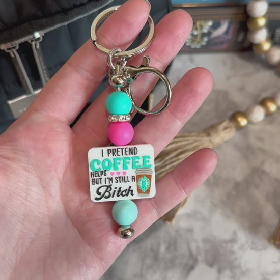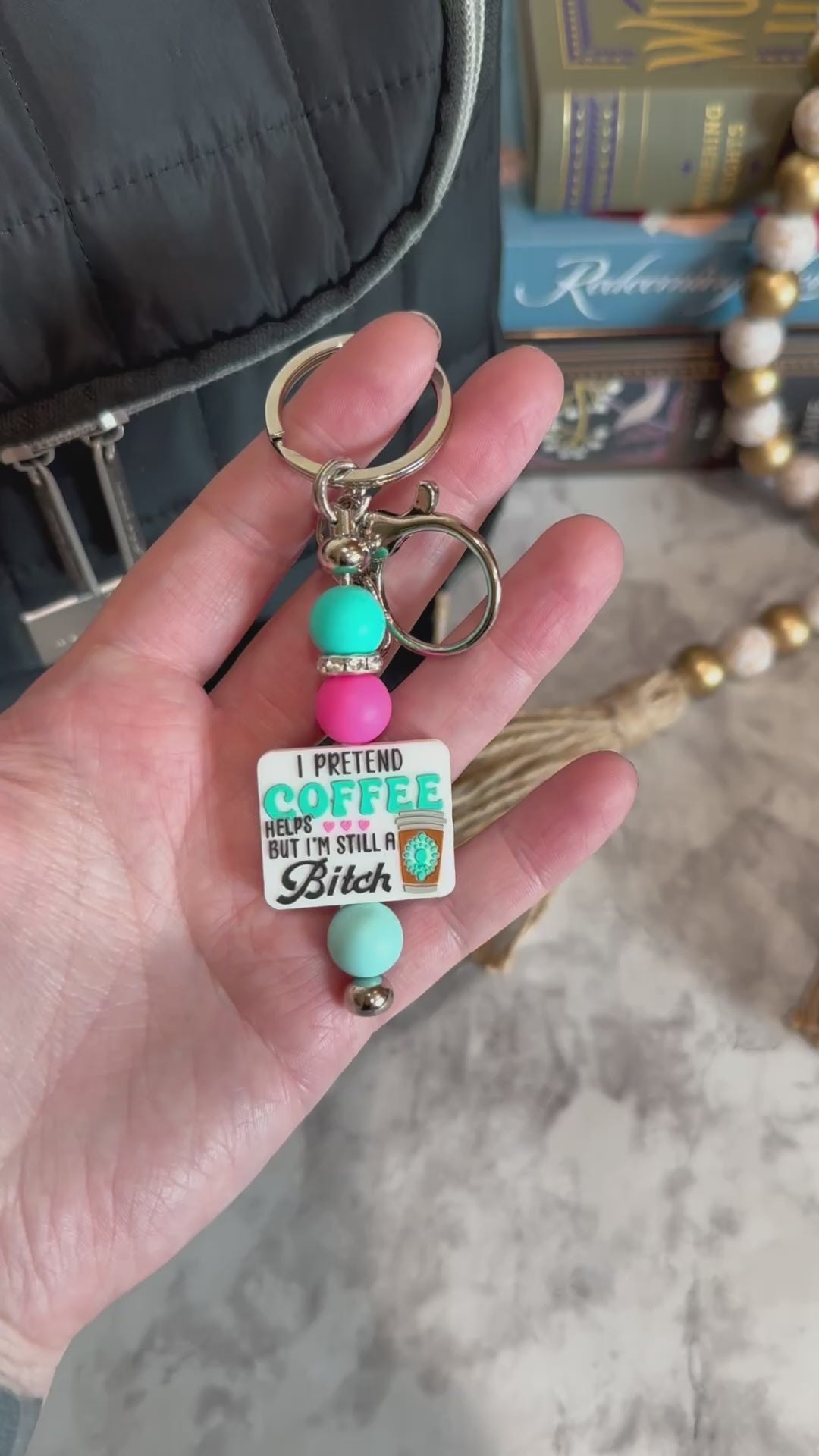 Add a splash of humor to your everyday essentials with this playful silicone bead keychain. Featuring a standout bead adorned with a cheeky coffee cup and the hilarious phrase "I pretend coffee helps, but I'm still a bitch," it’s perfect for coffee lovers who love to keep it real. Durable and lightweight, it’s an amusing way to brighten your keys or bag while showing off your sassy side.