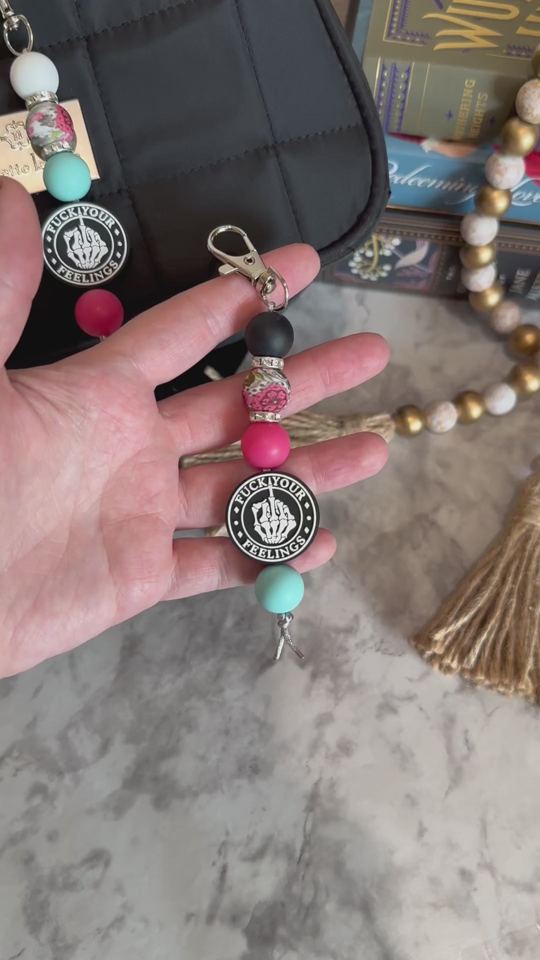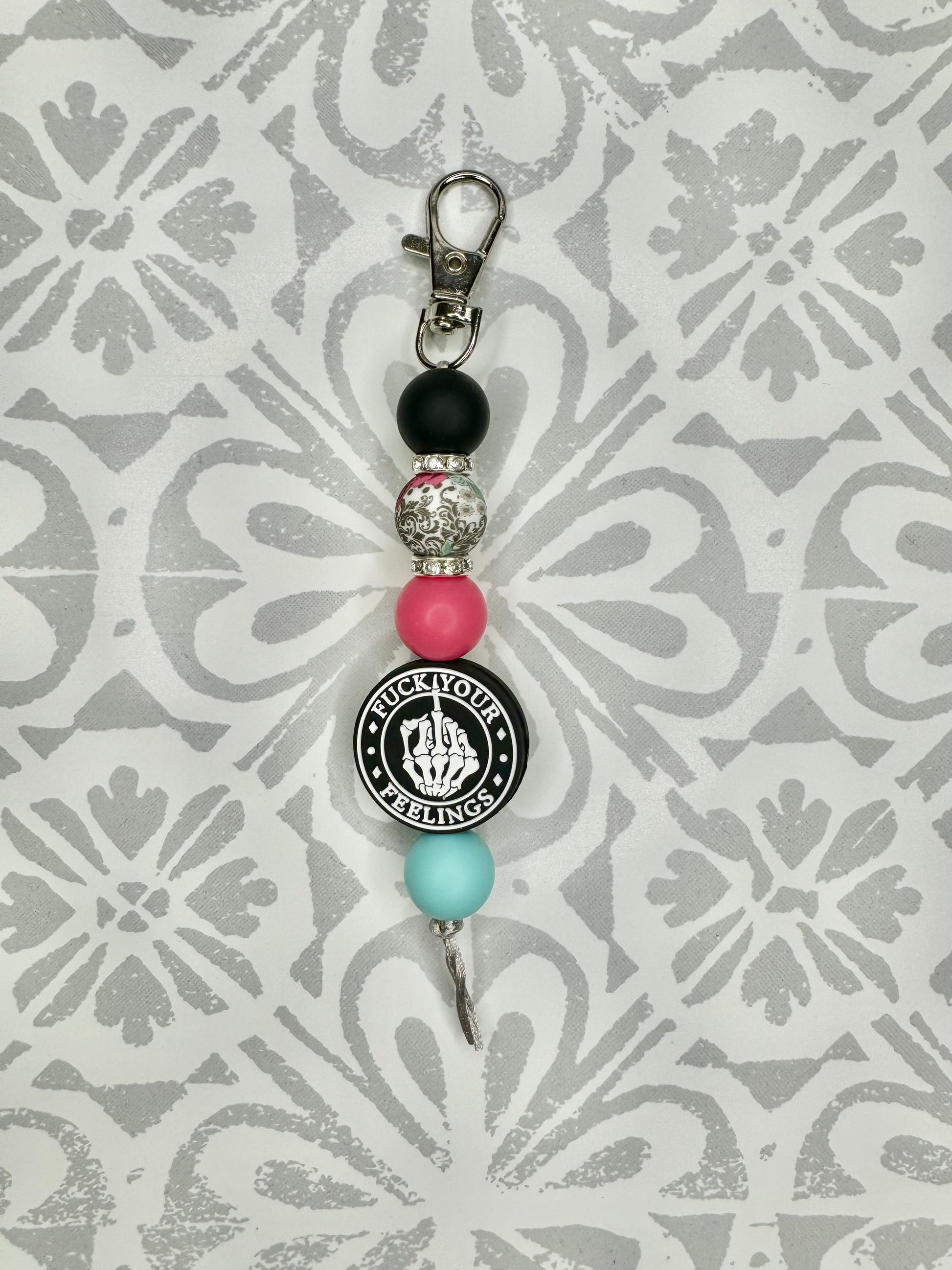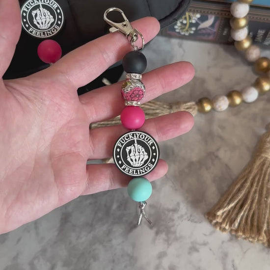 Make a bold statement with this playful keychain featuring a focus bead adorned with a skeleton hand giving the bird and the cheeky phrase “fuck your feelings.” Crafted with colorful silicone beads, striking floral patterns, and sparkly accents, it adds a fun, sassy vibe to your keys or bag while keeping your mood light and carefree.