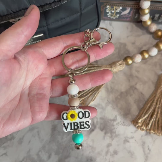 Carry positive energy wherever you go with this playful Good Vibes Keychain! Featuring a cheerful sunflower and a “good vibes” focus bead made from soft silicone, it’s the perfect little reminder to keep your mood bright and your spirits high. Lightweight and colorful, this keychain adds a fun touch to your keys, bag, or backpack.