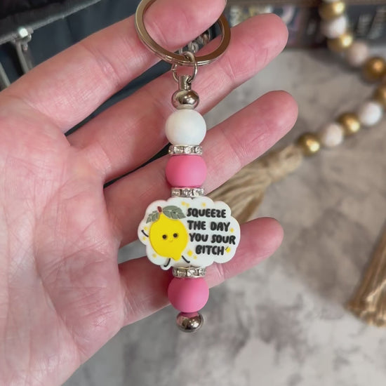 Add a splash of fun to your keys with the Squeeze the Day Keychain! Featuring a cheerful lemon bead that smiles and boldly says "squeeze the day you sour bitch," this silicone bead keychain brings a playful twist to your everyday essentials. It’s a perfect little reminder to stay positive and own the day with a wink. Durable and lightweight, it’s as practical as it is cheeky—great for anyone who loves a dose of humor wherever they go.